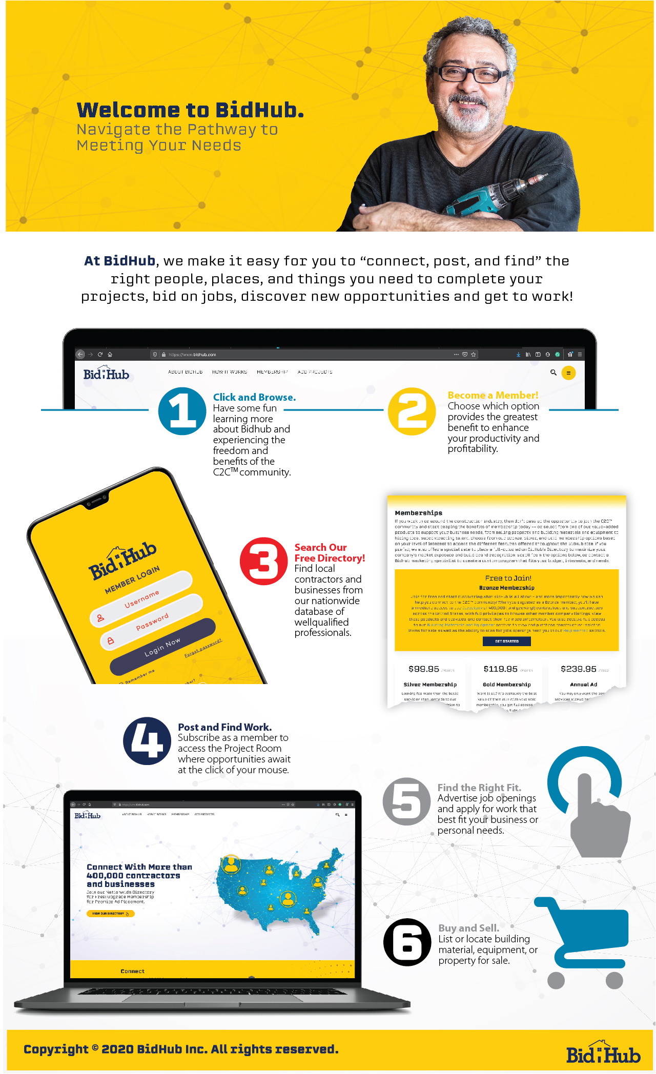 For BidHub, we developed a fresh branding campaign that brought their mission to life: helping people “connect, post, and find” the right opportunities. From a dynamic website and engaging social media to collateral, stationery, and infographics, the cohesive brand identity positioned BidHub as the go-to platform for projects and bids.